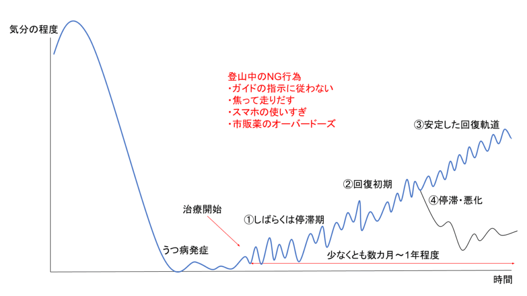 また、部活動や勉強、友人関係の維持など、もともと背負っている荷物を減らさずに無理を続けている状況では、停滞は避けられません。そのような場合は、登山計画を再度練り直すことが重要です。特に高校生の場合、大学受験を意識せざるを得ないため、無理を続けてしまい、停滞や悪化を繰り返すことが非常に多く、治療が難航しやすいという現実があります。