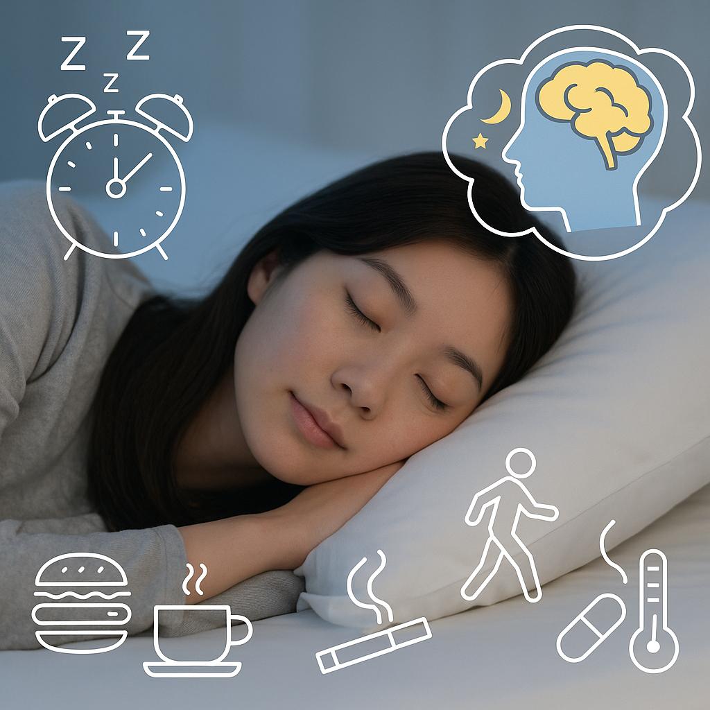 生活習慣として、早食いや夜食、朝食欠食、運動不足、長時間残業、電子機器の過剰使用などがNRSと関連し、また飲酒、カフェイン摂取、喫煙もリスク因子となります。さらに、几帳面で責任感が強いメランコリー親和性性格傾向が強い人ほどNRSの頻度が高いとされております。関連する睡眠障害には睡眠時無呼吸症候群(SAS)、レストレスレッグス症候群(RLS)、周期性四肢運動障害などがあり、入眠時の下肢のぴくつきによる覚醒が休養感の低下につながることもあります。心疾患(心筋梗塞、狭心症、心不全)や肥満、糖尿病、高血圧、脂質異常症などの生活習慣病、線維筋痛症・関節リウマチなどの身体疾患とも関連が報告されております。