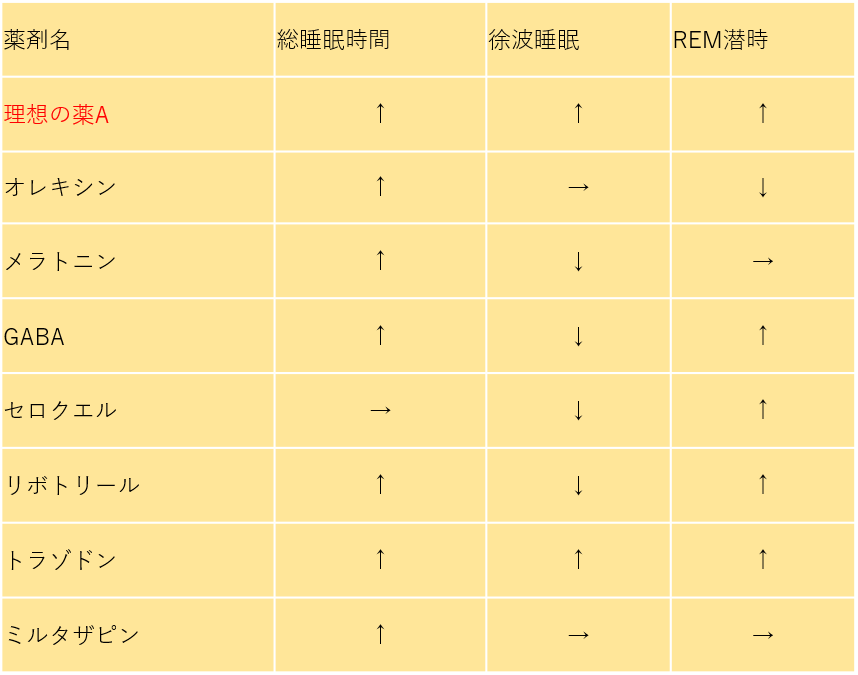 睡眠薬については、徐波睡眠(深いノンレム睡眠)を増やし、REM潜時(睡眠開始から最初のレム睡眠までの時間)を延長する薬剤がNRSのリスクを低下させる可能性があります。それらの要素を考慮し睡眠薬をまとめると以下の表の様になります。この表を参考にしつつ熟眠感を得られるような処方を組み立てることが重要となります。