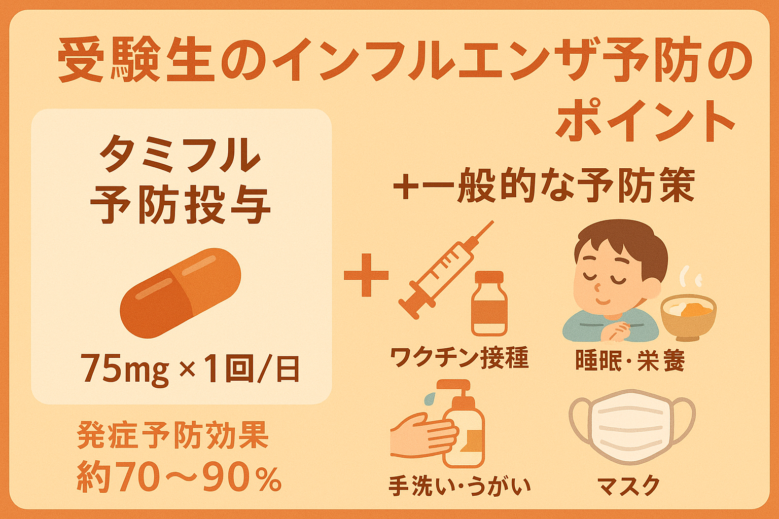 具体的には、家庭や塾でインフルエンザが流行している際、試験日から逆算して内服を開始します。13歳以上の場合、オセルタミビル 75mgを1日1回内服し、通常の治療量(1日2回)の半分の量で予防効果が期待できます。