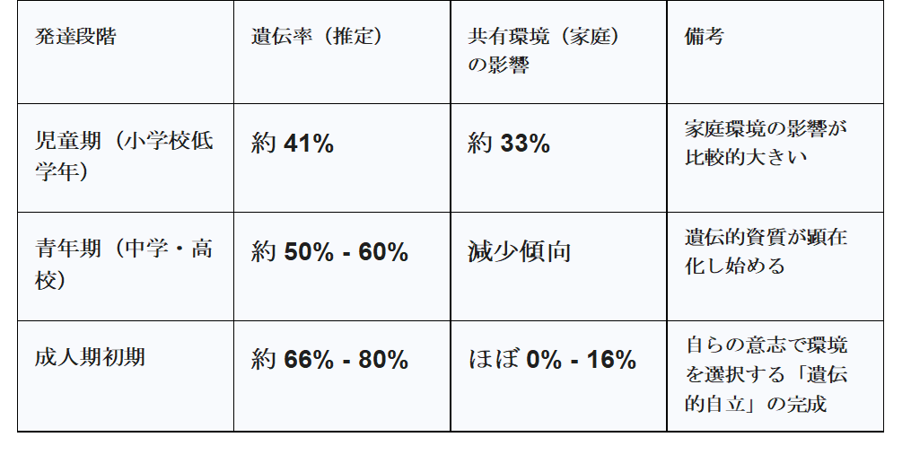 一般的な直感では、年齢を重ねるほど教育や経験(環境)の蓄積が個性を形作ると考えがちですが、行動遺伝学のデータは逆の結果を示しております。知能や学力の遺伝率は、児童期よりも成人期の方が高くなる傾向があり、これを「ウィルソン効果」と呼びます。この傾向は、子どもが親から離れ、自らの資質に適した環境を能動的に選択するようになる過程を反映しております。